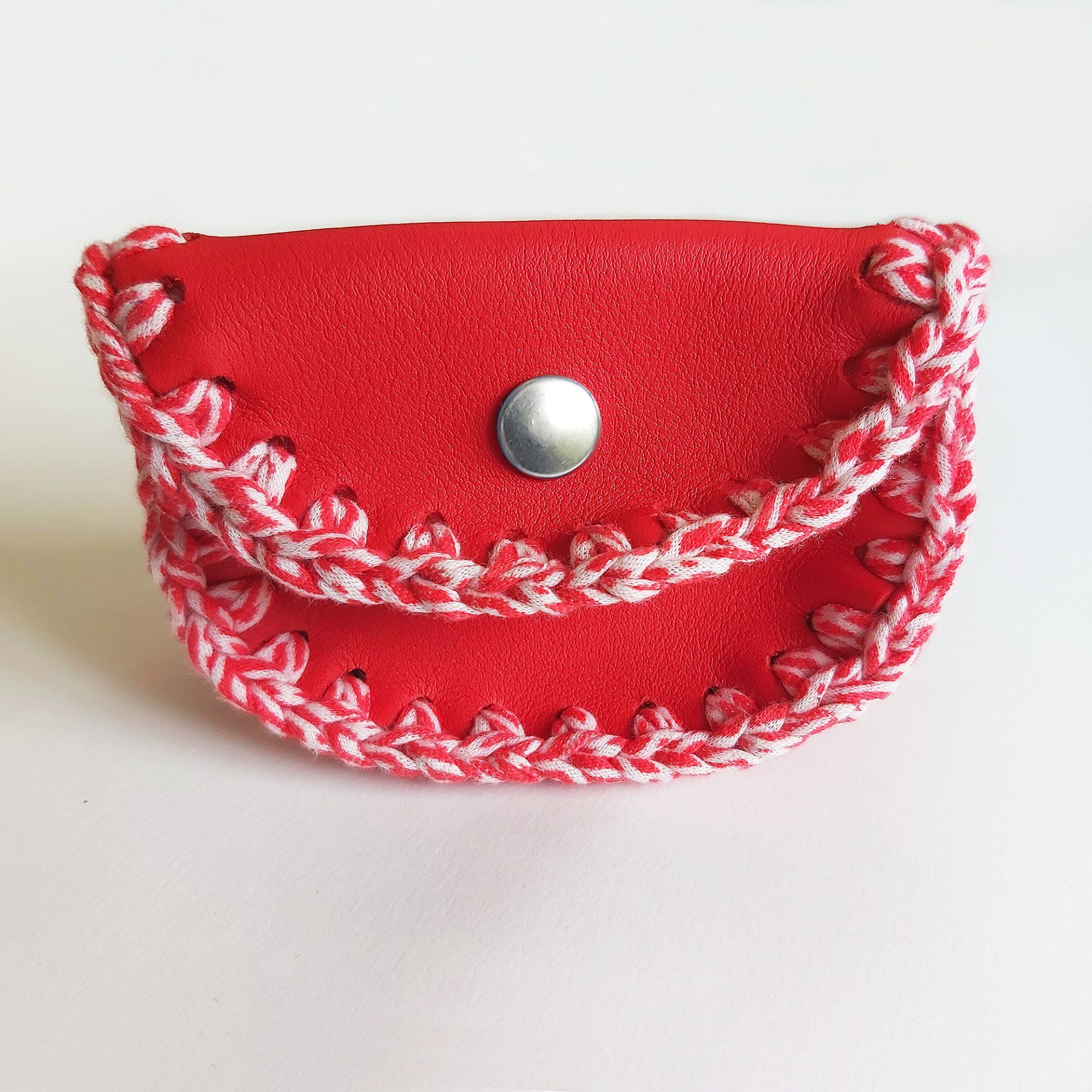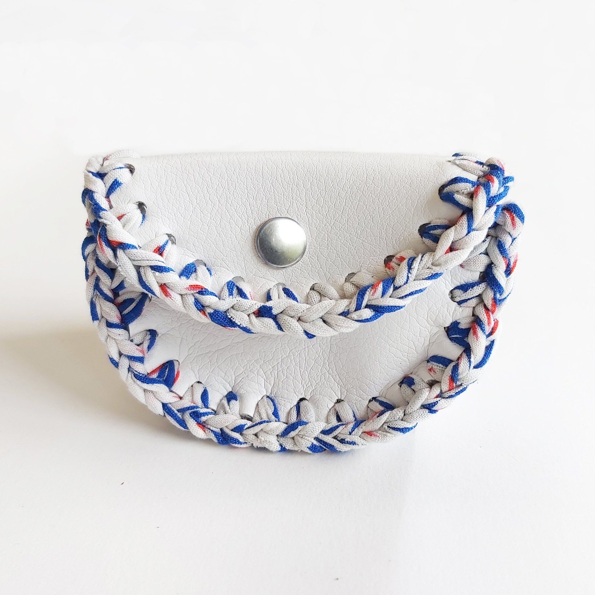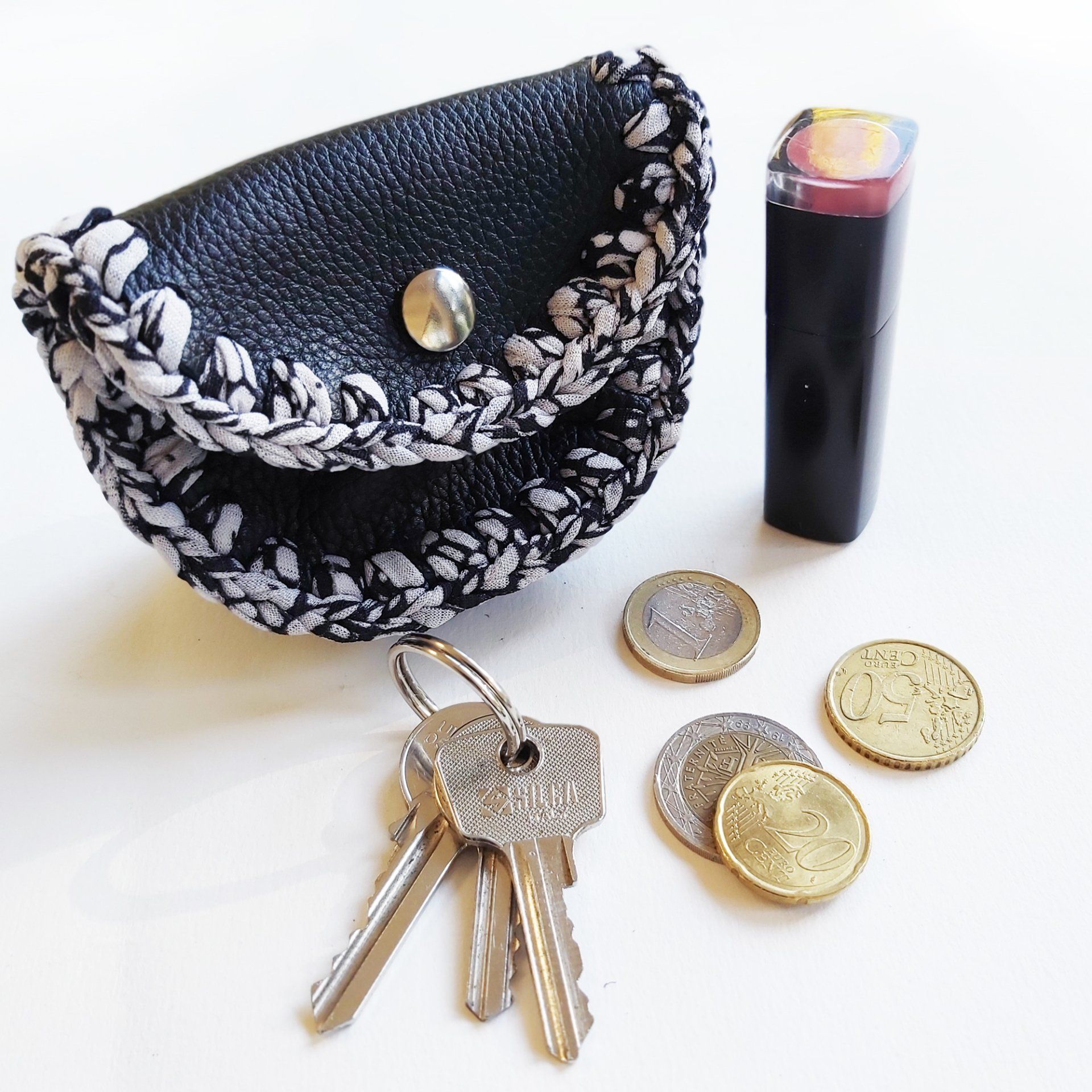 Porte-monnaie en cuir noir et crochet de tissu noir/blanc. Bouton pression 12mm argenté.