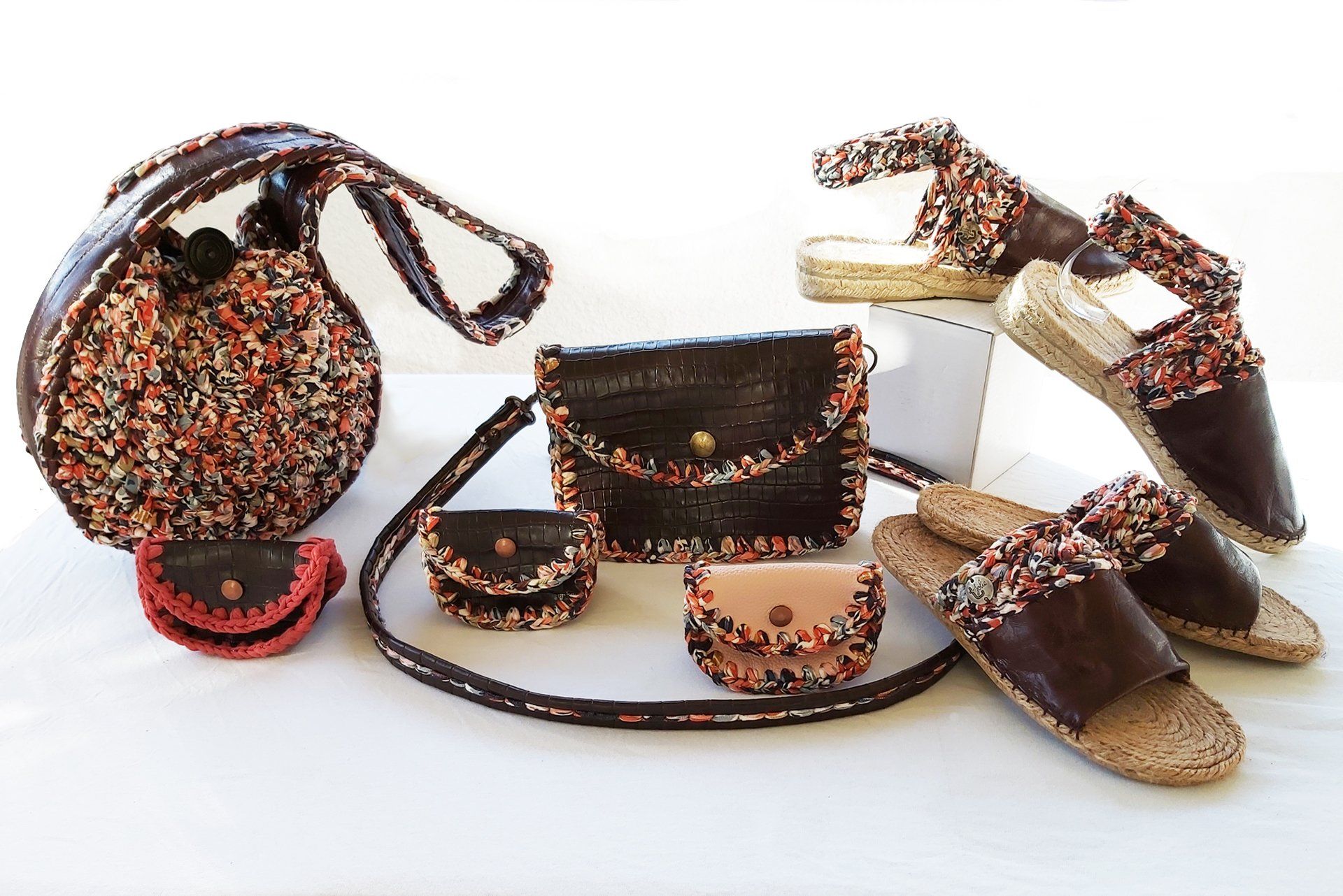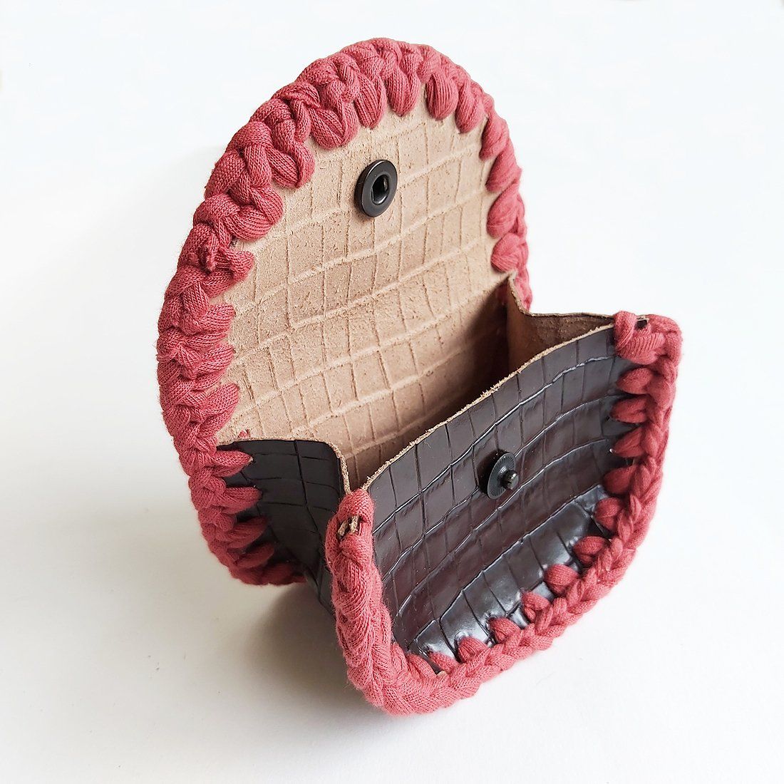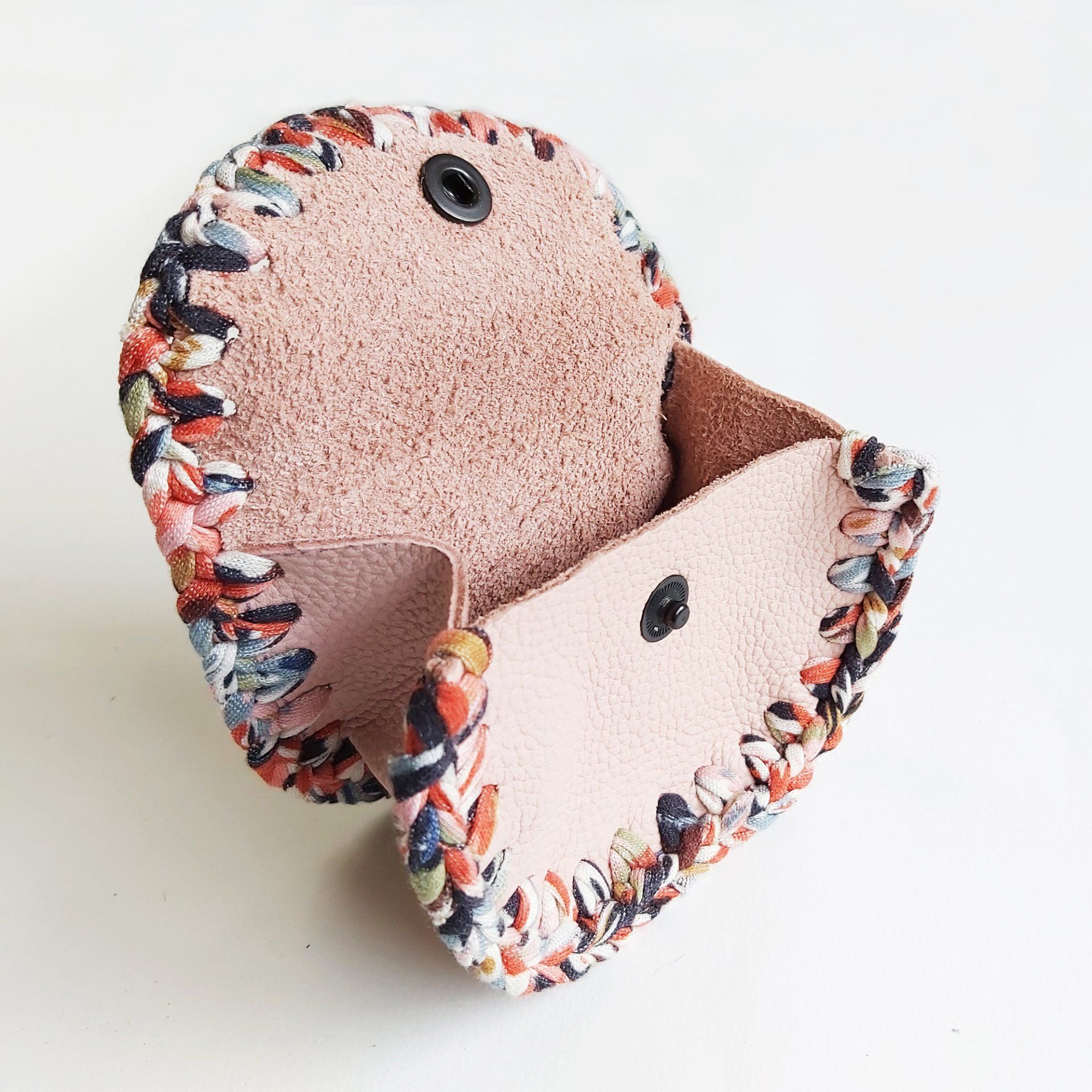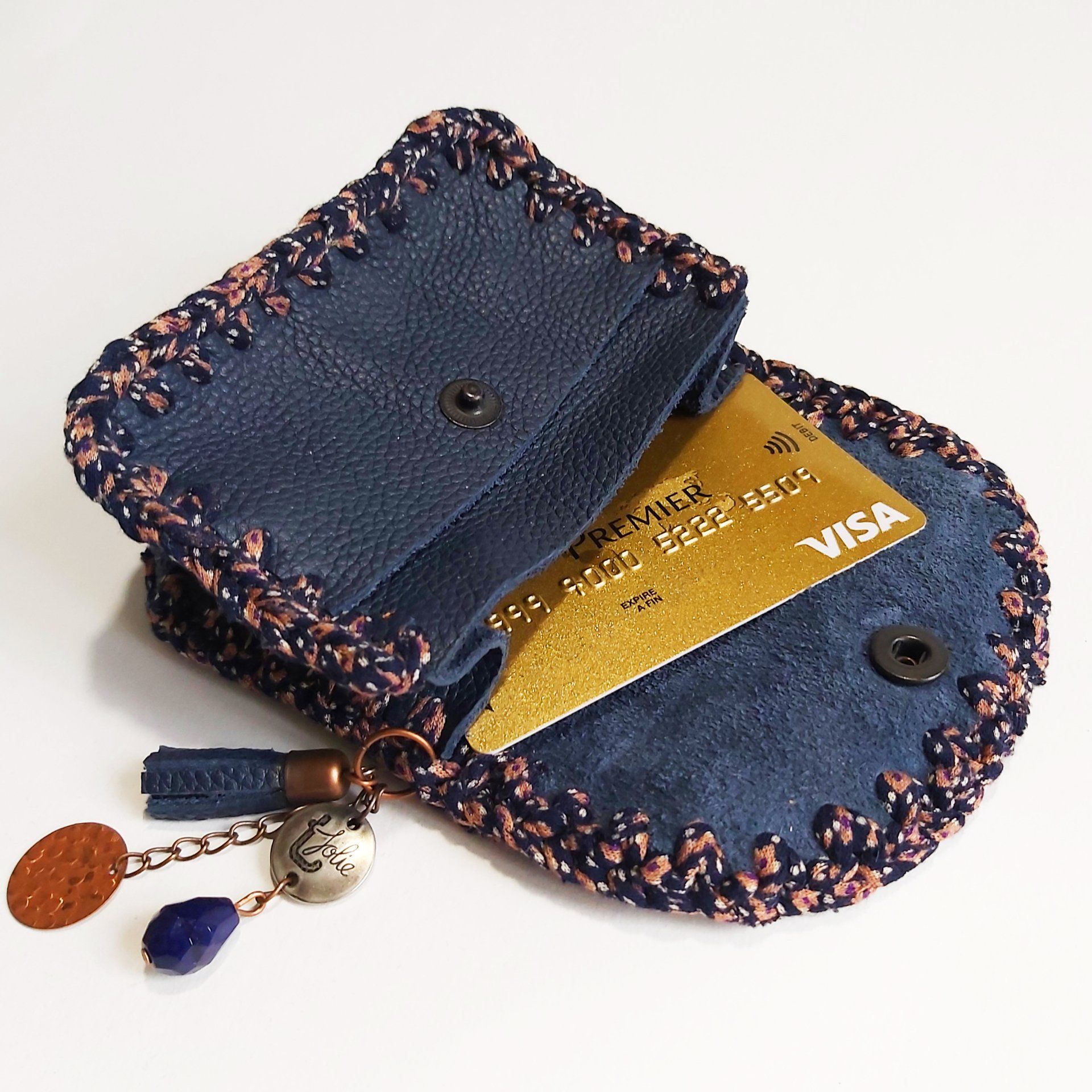 Porte-monnaie en cuir noir et crochet de tissu noir/blanc. Bouton pression 12mm argenté.