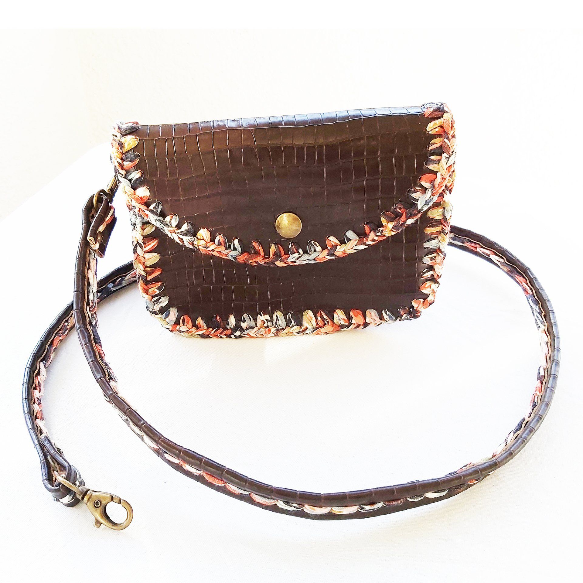 J'ai crée 2 différentes modèles de sacs. Un sac à main bandoulière en cuir et crochet avec 2 poches. Fermeture bouton magnétique.